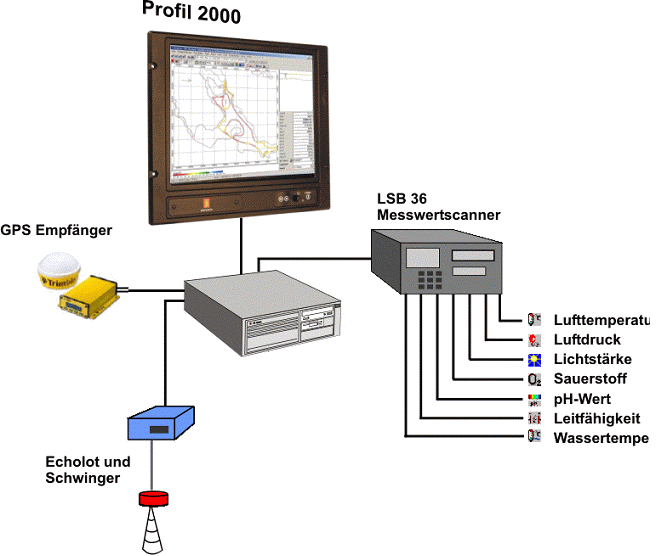 Die Hydrographische Vermessungssoftware Profil 2000 ermöglicht eine vielfältige Datenerfassung mit real-time Visualisierung. Neben Echoloten und Positionierungssystemen können zahlreiche andere Sensoren angeschlossen werden.